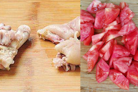 5、趁热把猪蹄脱骨,撕成小块。如果撕不下来的地方,可以用刀切下。把番茄择去蒂部,浸泡在淡盐水之中。清洗干净后,放在砧板上,用刀切成小块,放在一旁备用。
