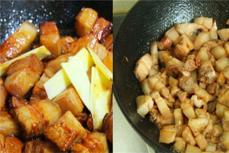 做红烧肉的第五步是一定要把红烧肉来回的翻炒均匀,让每一块五花肉都能上色,这样吃起来味道才是一样的。第六步是加一点热开水,这时候我们不用盖锅盖,用大火把它烧开,然后把上面的气泡用勺子舀走。第七步是加红枣和姜片,把大火改为小火,煮上一小时左右。第八步是用大火一边翻炒一边收汁,直到每块五法肉呈现出来的颜色都一样。