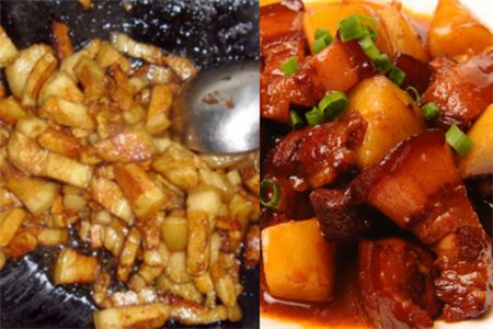 土豆红烧肉是一种川菜,制作方法也不难。做土豆红烧肉需要的材料有五花肉,土豆,蛋,芋头,胡萝卜,八角,五香,,葱,姜,蒜。做土豆红烧肉的第一步是选肉,我们一定要选择带皮的五花肉,然后把它清洗干净切成块。第二步是将油倒进锅里,然后放白糖和生姜片进出后来回的翻炒。第二步是将切好的五花肉一起倒进去,一直要炒到五花肉变黄为止。
