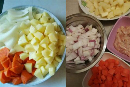 首先我们将买来的鸡胸肉切成丁,泰国菜大多讲究做出来的菜的肉质鲜美,保持原味,所以不愿意腌制鸡肉。然后我们将洋葱、土豆、胡萝卜和黄瓜也切成差不多大小的丁,然后将土豆块洗一下,将土豆块表面上的淀粉冲洗掉,然后放入碗中,放在一旁备用,可以将洋葱、胡萝卜和土豆放在一个碗里,黄瓜放在另外一个碗里,比较方便接下来的美食的制作。