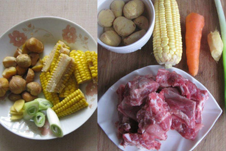 首先,准备好你所需要的各类食材:板栗、玉米、排骨、香菜以及盐等调味料。