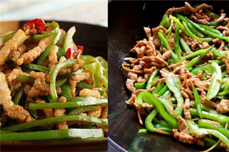 我们比较常见的家常菜还有青椒炒肉。青椒炒肉需要的食材有猪肉,红椒,姜,蒜,生抽,白糖,料酒,盐。第一步是把买来的肉用热水洗干净,然后把它切成丝。第二步是准备一个碗,倒入生抽,白糖,淀粉用手抓均匀,然后腌制十分钟左右。第三步是把青椒切成丝,姜蒜剁成沫,然后把锅烧热,倒入植物油,再把青椒倒进去炒。
