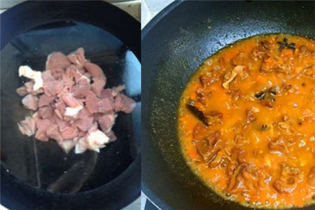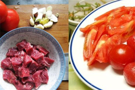 西红柿炖牛肉的第三步是把切好的牛肉放在锅里,再添加一点水烧开,煮几分钟后就关火,再把牛肉拿起来洗一遍,然后把水沥干。第四步是把烫好的西红柿和葱,姜,蒜切好后待用。第五步是把平底锅烧热后加入植物油,然后把配料再倒入锅里。第六步是待炒出清香味就可以把西红柿倒入其中,等西红柿炒出汁来,就可以把它盛在盘子里。
