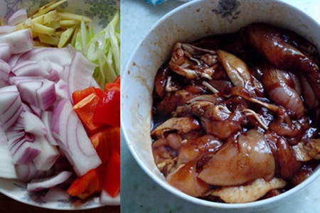大米用清水泡半小时以上。洋葱洗净切成小块,葱姜洗净切丝,辣椒洗净切小块,芦笋洗净切小段,西兰花掰开洗净。鸡腿去掉骨头并且用刀拍一下,装入容器中,加入适量生抽、老抽、白酒和白胡椒粉,用手拌匀,腌制三十分钟。
