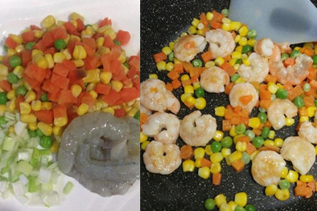 食材:鲜虾100克、大米2杯、胡萝卜50克、玉米粒50克、生抽、白糖、蚝油、盐、油、葱。