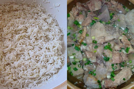 大米清洗干净倒入电饭煲,将炒锅里的食材和汤水也倒入砂锅,如果汤水不够,可以另外加少量清水,加盖,按煮饭键开始煮饭,煮熟即可。