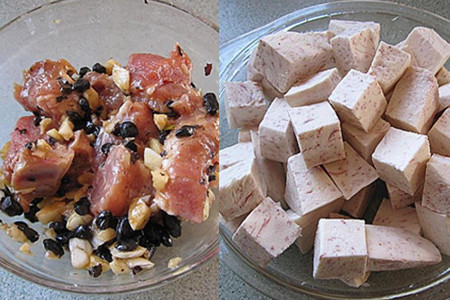 排骨洗净斩成小块,装入碗中。大蒜剥掉表皮,与和豆豉混合均匀,用刀一起剁碎。将剁碎的蒜和豆豉倒入排骨中,加入适量生抽、橄榄油、生粉和胡椒粉,用手搅匀,腌制片刻。芋头削掉外皮,切成小块。