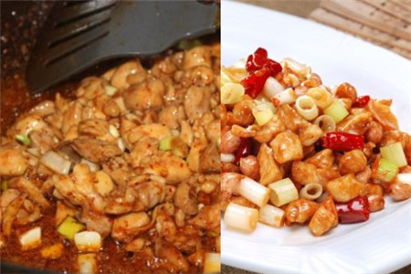 做宫爆鸡丁的第五步是把黄瓜丁和胡萝卜丁也倒入锅中用油炸,炸熟就行。第六步是不用把锅和油加热,就用凉油炸花椒和辣椒,炸出香味时就可以把腌制好的鸡肉倒在锅里炒。第七步是待鸡肉炒出一阵阵香味的时候,就可以把先前调制好的蜂蜜汁加进去,还有黄瓜丁,胡萝卜丁,花生米,葱加进去翻炒就好了。宫爆鸡丁是我们在饭桌上的必备美食。