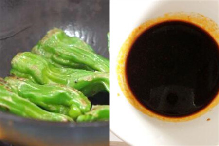 然后我们调制虎皮青椒的酱汁,在酱汁里,我们一般加入适量的生抽、糖、盐和食醋等调味料,然后将它们搅拌均匀,放在一边备用。然后我们在锅中加入适量的油,将整理好的青椒放入锅中煎,煎的时候要不断地进行翻面,以免让青椒太糊了,我们将青椒盛起来。然后我们再选一个干净的锅,加入适量的油,等油沸腾之后,加入葱姜蒜爆香。