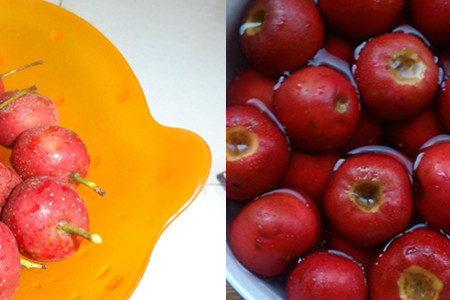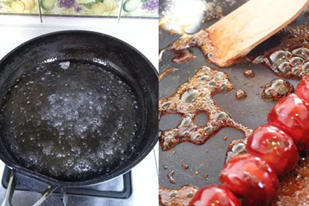 制作冰糖葫芦一定要用到结晶冰糖,按照3:1的比例取适量的冰糖和矿泉水,取不粘锅,将矿泉水倒入,接着放入冰糖后,就可以开始加热了。注意火候不要太大,因为糖浆很容易糊,制作冰糖葫芦,关键在于糖浆的熬制,如果这个步骤出了问题,那么,冰糖葫芦都做不成了。在慢慢加热的过程中,冰糖会渐渐融化,并且溶于水,用勺子不断搅拌,防止粘锅。