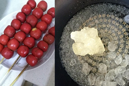 然后取出竹签将,做好的山楂,十个穿成一串冰糖葫芦,冰糖熬制十分钟左右就可以了。这时候会发现糖浆变得浓稠了,然后拿住竹签,把山楂在糖浆里滚几遍就可以了,然后放入冷藏柜,等待一个小时就可以食用了。