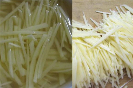 但是用来专门切土豆丝的工具不是十分的好用,用起来非常的不方便,如果我们学会了如何用菜刀来切土豆丝其实这样更好一些。我们都知道土豆很容易被氧化,被氧化之后的土豆很容易变黑,所以我们能把土豆丝切好之后要放在水里面泡着,不然十分容易变黑。