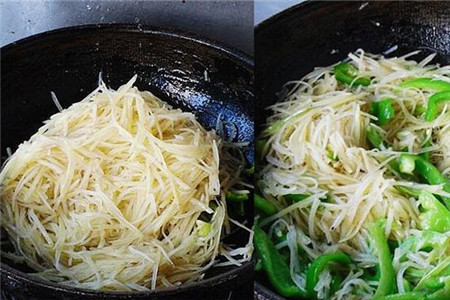 但是如果后炒青椒丝的话,可能炒出来的青椒丝有一点辣,所以还是建议大家先炒青椒丝,翻炒一会儿之后再倒入土豆丝。土豆丝本身就很容易熟,所以不用炒的太久,因为土豆丝炒的太久也不好吃。除了炒青椒土豆丝以外,我们还可以进行炝炒土豆丝。