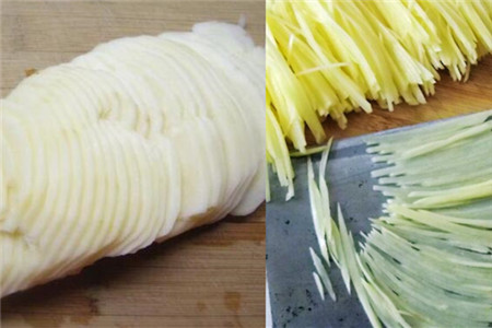 如果是第一次切土豆丝,那么可以开始的时候慢慢的切,如果刚开始的时候就很快的切土豆丝,很容易切到自己的手,总之我们在切土豆丝的时候一定要小心。当然如果家里面有土豆丝的神器,那么也可以用另外一种方法切土豆丝。