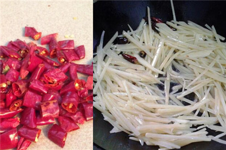其实炝炒土豆丝就是多准备一点干辣椒,把干辣椒切成小段,在油温比较高的时候把干辣椒放进去,然后翻炒一会儿再倒入土豆丝。干辣椒不能够炒的太久,不然它很容易在锅里面变糊,炝炒土豆丝的火一定要开的比较大,这样才能够快速将它炒好。