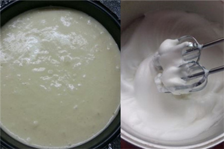 冰淇淋蛋糕的第二步是把蛋黄搅拌均匀,再添加一点白糖在里面继续搅拌。第三步是把牛奶和玉米粉放在里面搅拌,待蛋黄搅拌成蛋黄糊后就可以了。第四步是在蛋清里加点柠檬汁,搅拌起出泡后加点糖在里面继续搅拌,待搅拌成硬而发白的蛋白糊就行了。第五步是舀一勺蛋白糊到蛋黄糊中搅拌均匀,再把烤箱预热后待用。