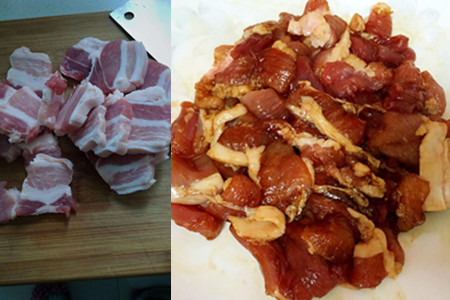 3、把洗干净的五花肉放在砧板之上,用刀切成片状。把切好的五花肉放在一个碗中,往里加入些许的生抽进行均匀地抓捏,放在一边腌制片刻。