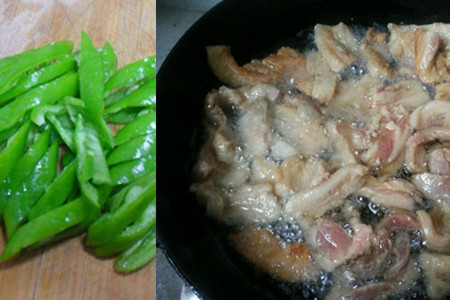 6、利用锅中剩下的食油,把辣椒和青蒜段全部倒入锅中,进行反复翻炒爆香。待其香味开始散发后,把五花肉放入锅中一起翻炒。青椒炒至断生后,加入些食盐、鸡精进行调味,便可出锅食用了。