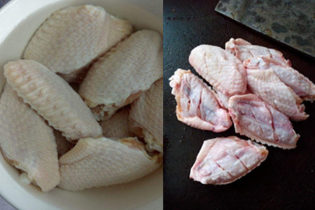 2、先将买回来的鸡翅浸泡在清水中,让其完全解冻,待解冻后再冲洗干净表面的血沫子。把洗净的鸡翅放在砧板之上,用刀在鸡翅上划上几刀,以便鸡翅充分吸味,放在一旁待用。