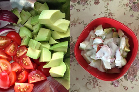 第三步,把切好的食材都倒在一个干净并且没有多余的水分的碗里,在这个过程中可以再放一些自己比较喜欢的其他东西,比如洋葱或者黄瓜等。