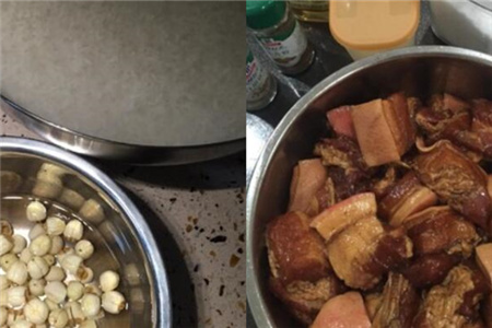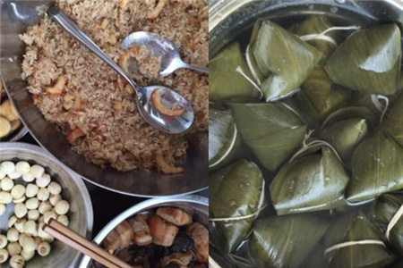 材料:糯米1500克,五花肉1000克,虾米50克,干贝50克,香菇50克,红葱100克,板栗100克,莲子50克,棕叶适量。