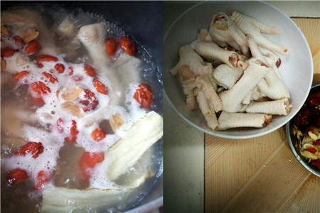 下面给大家说说药膳鸡爪的具体做法,首先把鸡爪子横切开,然后放在水里稍微煮煮,捞一下,以去除鸡爪的腥味和爪子里面的油。水里面要加入姜。然后把药材全部切好,药材可以放田七,百合,当归,可以切的细一点,小一点。这样的话药材里面的味道也更容易出来,也更加入味一点。
