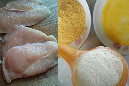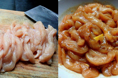 我们吃的鸡柳多数都是在外边的小吃摊上购买的,这种户外作业的加工车,环境卫生是没有保证的,而且我们也不知道它的用料是否健康,所以还是自己做起来比较好。鸡胸肉买来后用水清洗干净,然后放在案板上用刀切成长条,外面购买的鸡柳之所以味道好,跟事先用调料腌制有很大关系,所以我们取一些胡椒粉、鸡精和精盐、耗油等调味品腌二十分钟。
