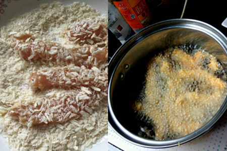 鸡肉腌好之后不能直接放在油锅里的,我们需要裹一些干淀粉,有些人炸鸡柳喜欢用面包糠,这个无所谓,只要能隔离开热油和鸡肉就可以。保证每个鸡柳外层都裹上淀粉,并且要去除水分,这样炸的时候就不会被油花迸溅到了。锅里倒入适量的食用油,然后加热到八层左右,可以先用鸡柳试一下油温,泛起剧烈的油花就可以开始炸了。
