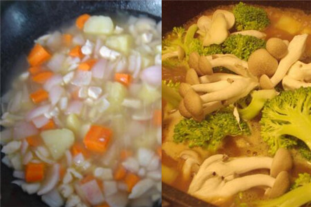 在煮意大利面的时候,我们将牛肉块、西兰花块、胡萝卜块、洋葱块放入锅中,加清水煮开,然后我们在锅中放入适量的咖喱,希望做出来的咖喱牛肉意大利面浓稠一些的话可以多加一些咖喱,然后我们将锅中搅拌均匀,加入煮好的意大利面,将它们进行不断地翻炒,直到意大利面将多余的汤汁吸收干净之后,就可以将它们盛起来装盘了。