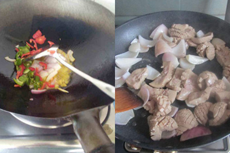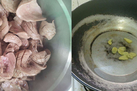 准备两个洋葱,剥去外表的外皮,放在案板上切成薄片,这个时候可能会流眼泪。切好后放在清水里清洗干净就捞出来,再准备一些葱花、蒜片就开始制做了。锅底放油,油热后把葱花放进去,再把腰花放进去翻炒,腰花炒制颜色变浅就可以放入洋葱了,加一些食用盐。