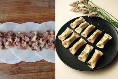 第五,醒好的面搓成长条后分成若干小份,用擀面杖擀成圆形的面皮。在面皮上填上馅料,两头开口子,其余的边缘部分捏紧。