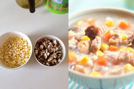 第二,大米淘净后浸泡1h左右;香菇、猪肉和胡萝卜洗净切小丁;玉米煮熟后掰成玉米粒儿