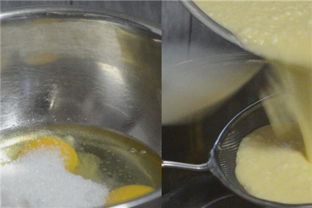 先把鸡蛋用打蛋器打匀,加入盐和50克白糖,继续用打蛋器搅拌均匀。黄油隔水慢慢融化至液态,和全脂牛奶一起加入蛋液之中。