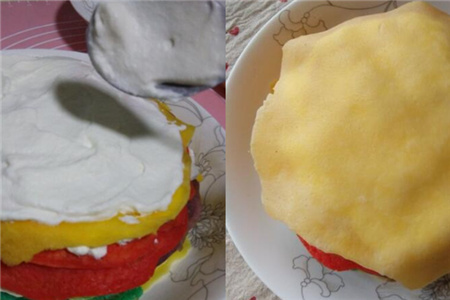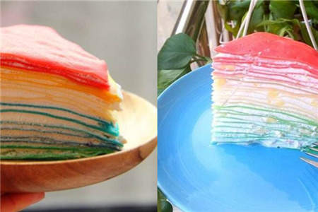将面饼按照彩虹颜色的顺序进行摆放,每层面饼之间涂上一些奶油。这样彩虹千层蛋糕就全部制作好了,切开后你就会看见绚丽颜色了,是不是有一种很浪漫的感觉呢。