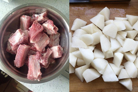 2、先将从市场买回的新鲜的排骨洗净表面的血沫,用刀斩成小段。白萝卜刨去外皮,洗净后用刀切成滚刀块。玉米剥去外皮,撕去上面的须,用刀切成小段。生姜切成薄片,枸杞浸泡在清水之中,浸泡软后便可捞出。