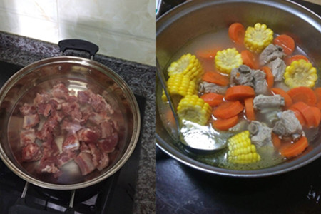 4、另取一锅或者清洗之前的煮锅,同样往里添入足量的清水。再往水中逐一加入些许的生姜片、料酒、焯好水的排骨,大火烧开汤汁冒泡后,用漏勺小心地捞出上面的浮沫。改为小火,盖上盖子炖煮一个钟头。再往里加入萝卜块和玉米,继续煲上半个小时。临出锅前,撒上些食盐进行调味,再把枸杞加入其中便可出锅食用了。