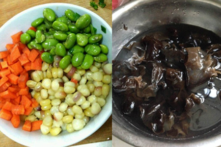 2、先将买回来的新鲜毛豆壳剥开,取出里面的毛豆。木耳泡发在清水之中,浸泡至软后。用剪子剪去根部,再切成小丁状。玉米剥去外皮,把玉米粒剥下来。如果觉得太麻烦,也可以直接从超市购买现成的玉米粒。把胡萝卜削去外皮,香菇剪去根部,把它们一齐放在清水中清洗。洗净后放在砧板上,用刀切成丁状,放在一旁待用。