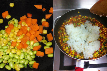 3、将适量的食用油倒入炒锅之中,油温烧热开始冒小泡后。把胡萝卜丁、毛豆、玉米粒全部下入油锅中。用铲子翻炒片刻后,再把香菇、木耳加入其中一起煸炒。这时候往炒锅中加入些许的蚝油,接着再往锅中倒入适量的清水。盖上锅盖,大火烧开沸腾后。把米饭倒入炒锅中,用铲子把米饭搅散成颗粒状。