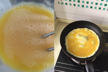 蛋液里一定要加些淀粉,这样做出来的蛋皮才不容易破。炒饭里使用的食材,可以根据个人的口味来决定。