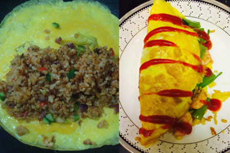 5、将适当的食油倒入炒锅之中,沿着锅边淋入鸡蛋液。小火煎至蛋液开始凝固后,把之前炒制好的米饭放在蛋液的一边,把蛋皮覆盖上米饭。在蛋皮上挤上些番茄酱便可食用了,挤番茄酱的时候可以根据自己的喜好来DIY各种图形。炒饭的米饭一定要使用前一天的米饭,这样做出来的炒饭才会颗粒分明。如果使用现煲的米饭,做出的炒饭会团在一块,影响吃起来的口感。