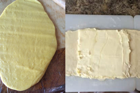 step4:对松弛好的面团进行处理,将其擀成长方形形状即可,随后取出片状黄油,将片状黄油置于面团的中间位置。