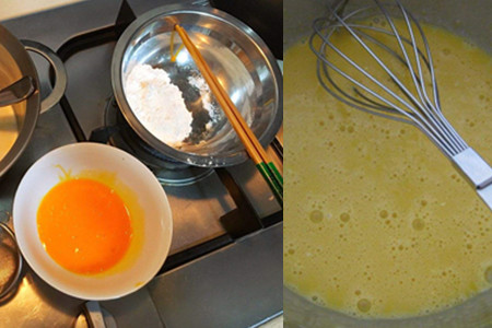 step2、将奶溶液置于室温下冷却,待其不烫手后加入事先备好的鸡蛋黄和鸡蛋清,然后借助筛子进行过滤。