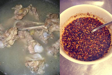 1、准备的食材有面条、猪骨、辣椒面、芝麻、花生米、冬菜、榨菜、香菜。