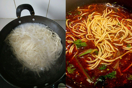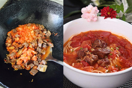 7、另取一煮锅,将适量的清水倒入煮锅之中。水烧开沸腾后,把面条下入锅中,煮至完全断生,便可捞出放在一个大碗中。把之前制作好的茄汁牛肉卤淋在面条上,便可食用了。