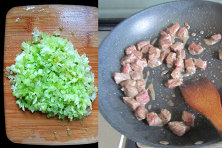 2、先将新鲜的牛肉放在流水下,冲洗干净上面的血沫。把处理干净的牛肉放在砧板之上,用刀切成小粒状。往里逐一加入些许的生抽、料酒用手进行均匀地抓捏,放在一旁腌制十几分钟左右。