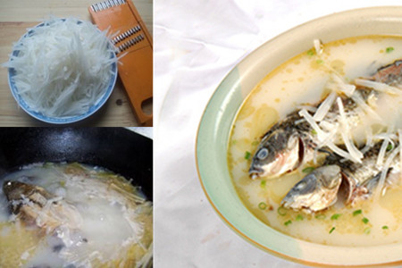 锅里面先倒入一些食用油,将鲫鱼的双面都煎熟,然后加入水煮15分钟,当然是需要放生姜。再放入萝卜丝一起炖煮。