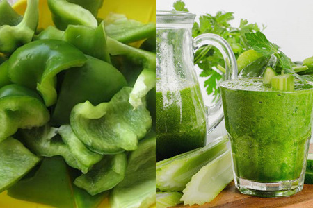 首先将青椒、苦瓜、芹菜洗干净,再将它们切成小块。将它们放入果汁机中,再加入冷开水,开启开关,将它们榨成汁。随后用刀将苹果以及黄瓜的皮削去,再将它们切成块。接着把它们倒入盛放着蔬菜汁的果汁机中,并将它们打成汁。待榨好汁之后,就可以把它们倒入杯中了。这款蔬果汁具有降低血压以及美容养颜的神奇功效。