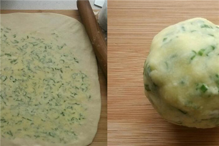 先用微波炉将纯净水进行加热,水温大约在40度左右的时候将酵母放入水中化开(温水可以有效增加酵母的活性)。将纯净水和酵母一起加入低筋面粉中,用手或者筷子揉搓面团。等面团基本成型的时候,可以将葱、黄油、盐、泡打粉、芝麻等材料一起加进去。