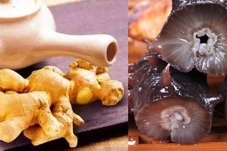 准备熬粥的时候,我们把海参切成小段,把姜和海参放在一个碗里,用料酒腌制,放些葱、姜、蒜备用。海参是少有的高蛋白、低脂肪的的健康食物。它能消除疲劳,令人精神焕发,防癌抗癌,被称为人身体的保鲜剂。