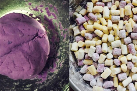 只需要将其洗干净后放入微波炉里加热十分钟,取出来的时候小心烫手。芋头、山芋、紫薯剥去外皮,分别放在三个碗里,分别捣成泥状。将木薯淀粉和马铃薯淀粉均匀的分成三份,均匀的加入三个干净的碗中,慢慢的倒入100毫升开水。